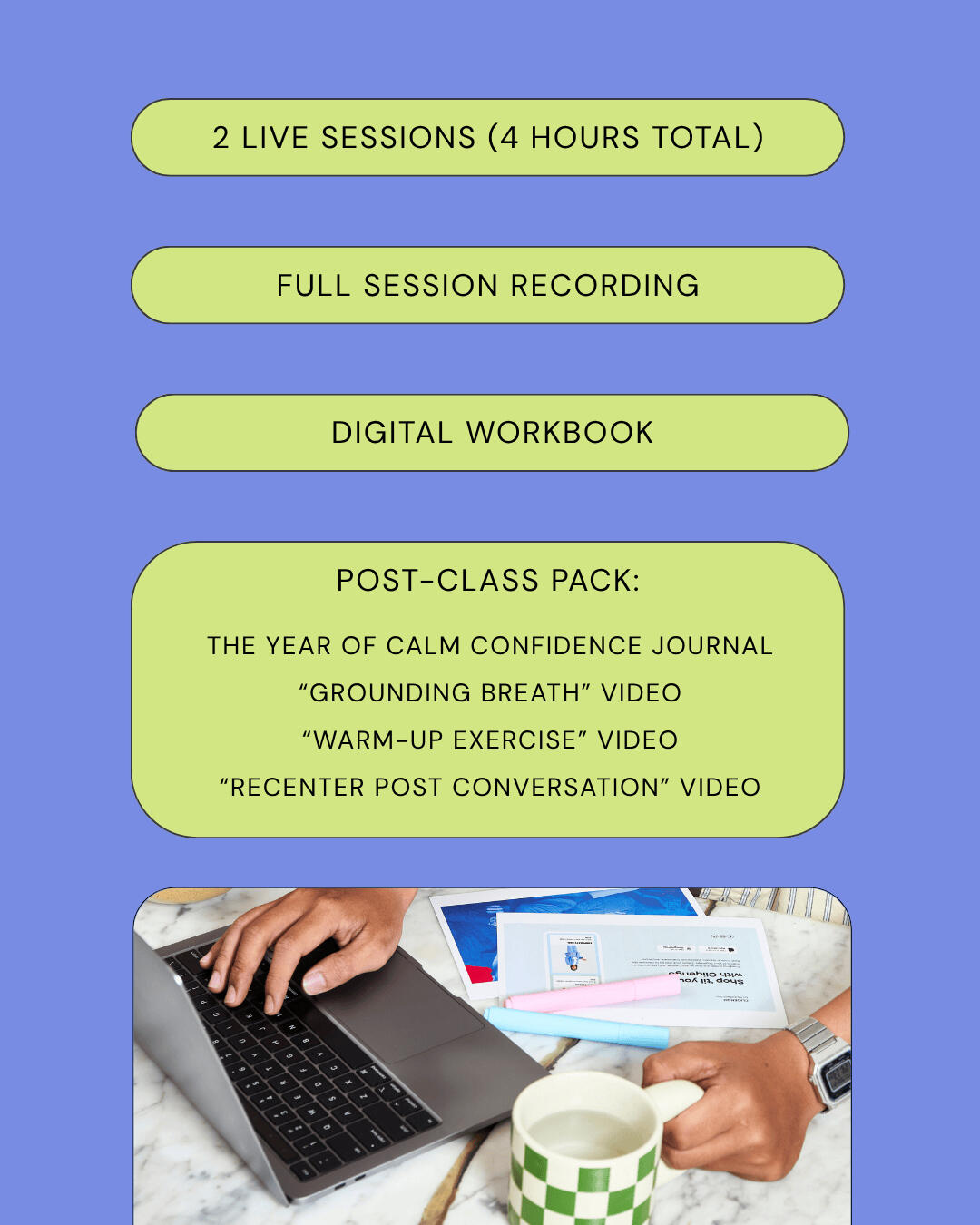This workshop comes with everything: live sessions, recordings, guided exercises, and a digital workbook. So you can learn at your pace, revisit the tools, and stay consistent throughout 2026.